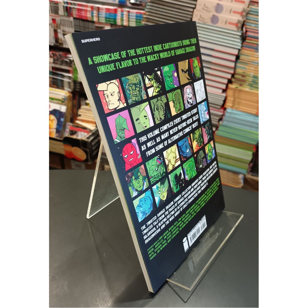 In the tradition of Marvel's Strange Tales and DC's Bizzaro Comics comes Twisted Savage Dragon Funnies, a showcase of the hottest indie cartoonists bringing their unique flavor to the somewhat wacky world of Savage Dragon! This volume compiles every twisted story as well as many never-before-seen tales from some of alternative comics' best! The Twisted Savage Dragon Funnies collection amasses every beautiful and brutal Twisted Tale from the pages of Savage Dragon and then some! From the surreal to the hilarious, a heaping helping of alternative visionaries have their way with Erik Larsen's Dragonverse and the wide array of crazy characters that inhabit it.